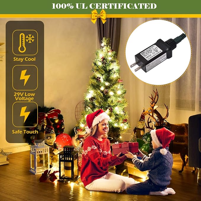 - 【Pre-lit Tree with Charming Lights】 This pre-lit Christmas tree comes pre-strung with 40 lights, saving you the time and effort of arranging lights manually. These lights beautifully illuminate the tree and create a joyful ambiance for your holiday family gatherings. Additionally, the plug is UL certified to ensure safe usage.