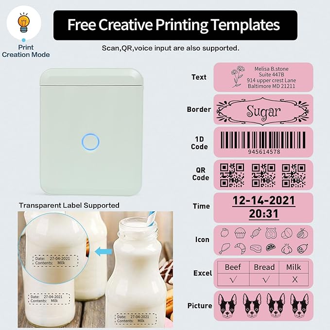 - 【ATTENTION & PRINT】 - The App is downloaded from APP STORE or Google Play and supports bar-code, qr code, picture, scan code, text, Excel import, smart OCR scanner, massive vivid icons, easily create your own customized labels , preview and save record, improving efficiency.It can be Large-capacity continuous printing, which can complete 50-160 more than one continuous repeat printing.