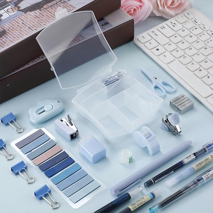 - Blue Suit: mini office supply kit includes 1 mini stapler, 1 sharpener, 1 tape dispenser, 1 scissor, 1 staple remover, 500 pieces of staples, 20 pieces of paper clips, 5 pieces of pens, 1 fluorescent pen, 12 pieces of long tailed clips, 1 note, 1 small telescopic knife and 1 box; A set of packaging can meet your various office and study needs and save your matching time