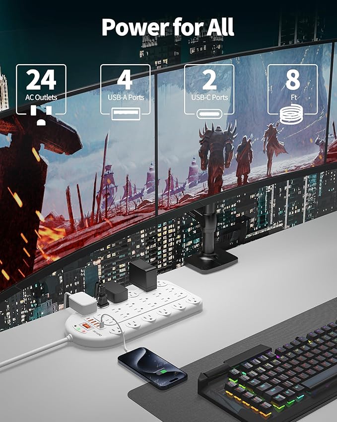 - 【Power for All】-Features 24 grounded outlets, 4 USB-A ports, and 2 USB-C ports, 15A/125V/1875W, 8 feet heavy-duty extension cord to allow you to power up your gaming or media setup, computer, laptop, phone, and camera at the same time. One charging station for a clutter-free desk.