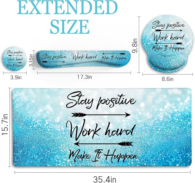 - Positive Mouse Pad Set: The blue stay positive mouse pad set includes large desk mat (35.4×15.7inch), mouse pad with wrist rest(9.8 x 8.6inch), keyboard wrist rest (17.3 x 3.15inch), cup coaster (3.9" x 3.9"). The extended desk pad fits almost full-size keyboards and mice, providing plenty of space for gaming or office work