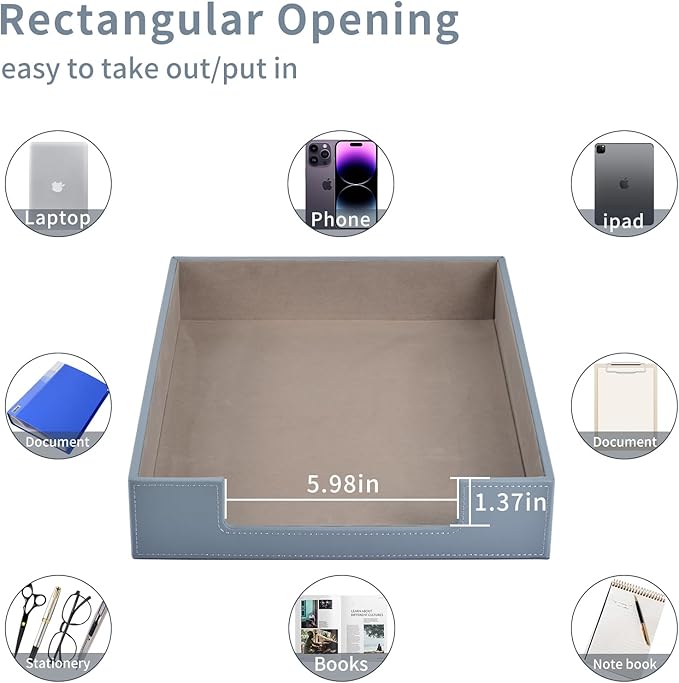 - The desk organizer to be very well made. The interior is lined with a velvet type material. It is sturdy and has a felt lining for a more luxurious look. The edges of the tray are stitched with white thread. The stitching is clean, even and there are no stray fibers. I believe this grey tray would look good on any desk and in any style home or office. It's great for holding magazines, documents, newsletters, files and papers. It can be used as an in or out box for your mail.