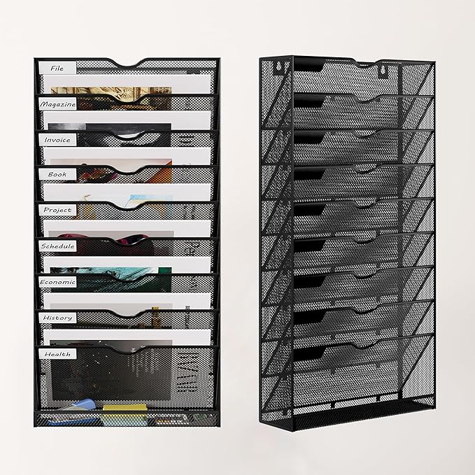 - Durable: The Mail organizer wall mounted is made of durable metal with a coating that extends the life of the wall mount. The metal mesh construction reduces weight while keeping air circulating through the wall paper organizer, so you don't have to worry about mold and mildew on your documents or papers