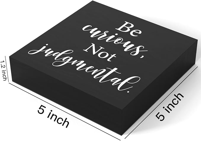mmiishe Inspirational Wooden Box Sign Decorative Motivational Be Curious Not Judgmental Wood Box Sign Home Bedroom Office Decor Rustic Farmhouse Square Desk Decor Sign for Shelf 5 x 5 Inches-505