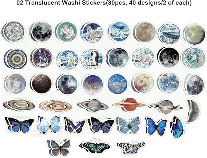 - Design: 120pcs vintage printing papers with 60 designs , 2 pieces of each; 80pcs washi stickers with 40 designs, 2 pieces of each.