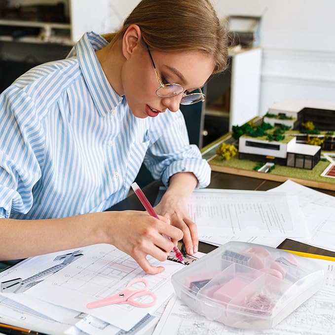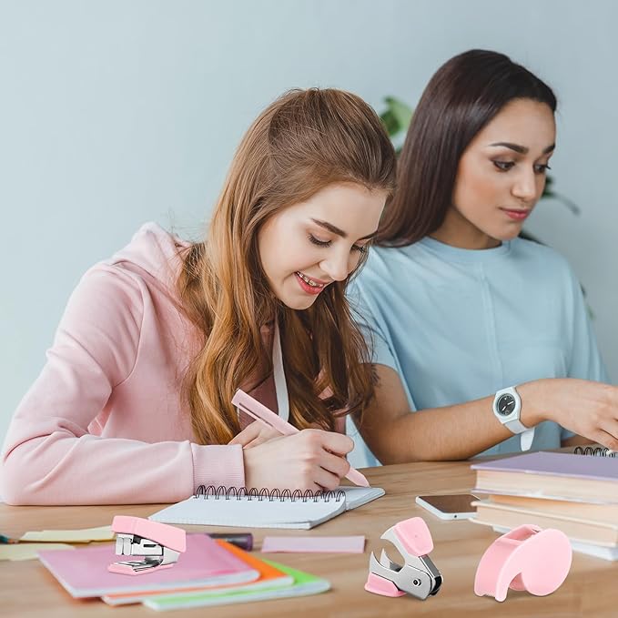 - Pink Suit: mini office supply kit includes 1 mini stapler, 1 sharpener, 1 tape dispenser, 1 scissor, 1 staple remover, 500 pieces of staples, 20 pieces of paper clips, 5 pieces of pens, 1 fluorescent pen, 12 pieces of long tailed clips, 1 note, 1 small telescopic knife and 1 box; A set of packaging can meet your various office and study needs and save your matching time