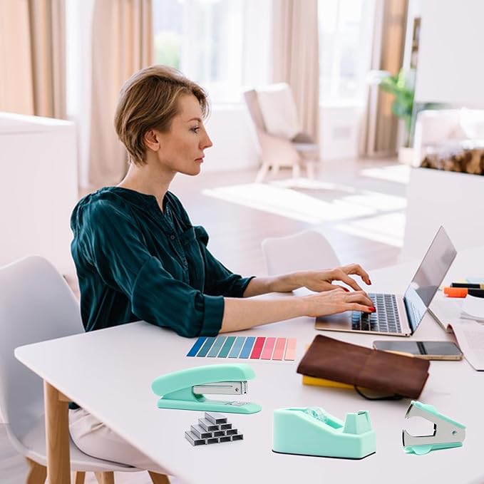 - 【Package Includes】 This teal office supplies contains 1x Green Stapler, 1x Green Staple Remover, 1000x Staples, 1x Green Tape Dispenser, 1x Office Scissor, 40 x Green Push pins, 50 x Green Paper Clips, 10 Colors waterproof tabs.