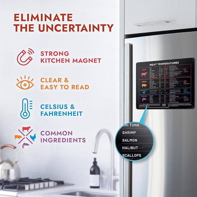 - VISUAL CLARITY & EFFICIENCY — No more frantic searching through drawers or apps mid-cook. This conversion chart for cooking is like having an assistant ready at a moment's notice. No more doubts or double-checking. Walk over to the kitchen magnets on your fridge to get the exact information you need. You confidently cook your meats or seafoods to perfection