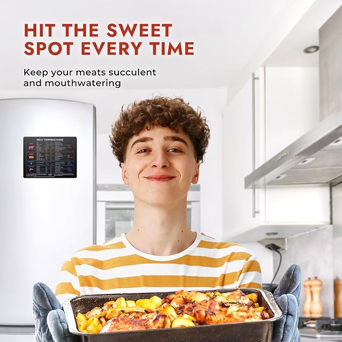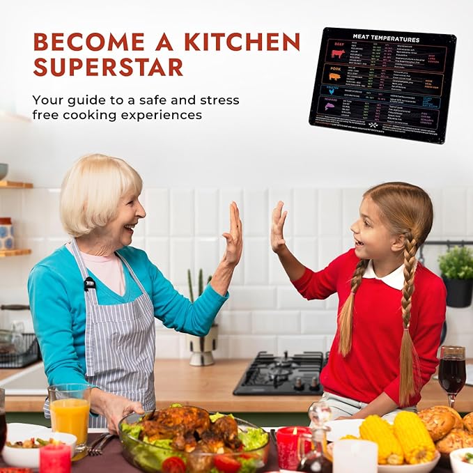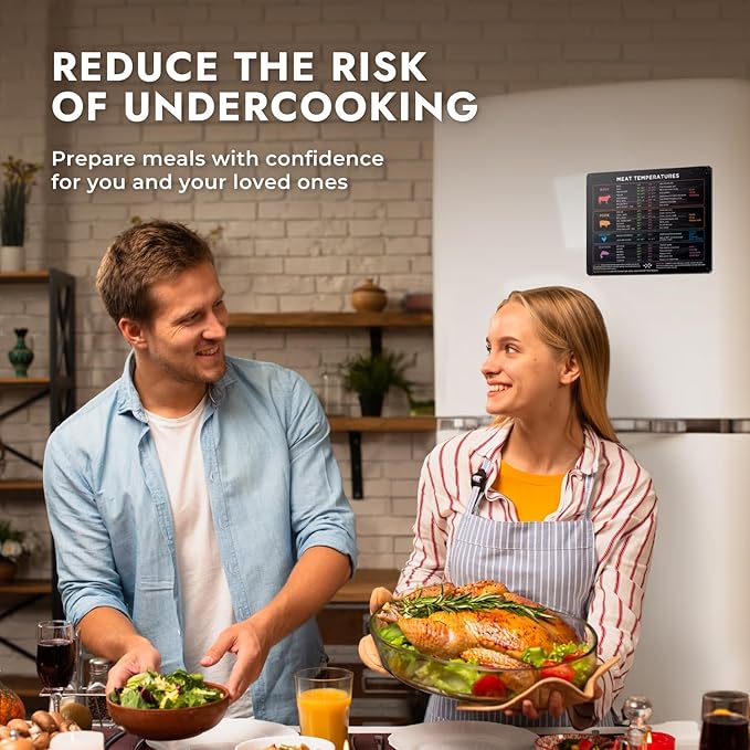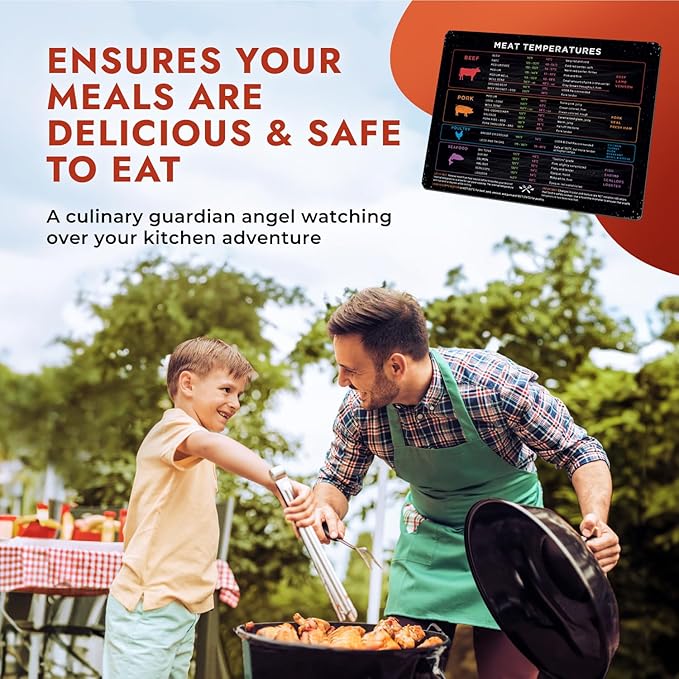 - ENHANCED FOOD SAFETY — With a meat cooking temperature chart, you get a crystal clear roadmap to culinary safety. These cooking tools help make sure you don't serve undercooked, potentially harmful dishes to you, your family or your guests. Hit that magic steak temperature with the help of your meat doneness chart magnet and unlock a flavor explosion