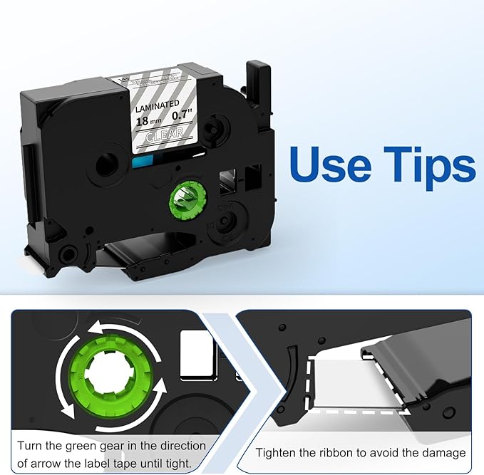 - [Features] TZ laminated 18mm 0.7 white on clear that use thermal transfer printing technology are better for indoor and outdoor use. These print clearer and more durable labels in harsh environments. Withstand water, fade, abrasion,grease,high and low temperature, strong adhesive. The backing has a slit in the middle and easy to peel. No residue when removed