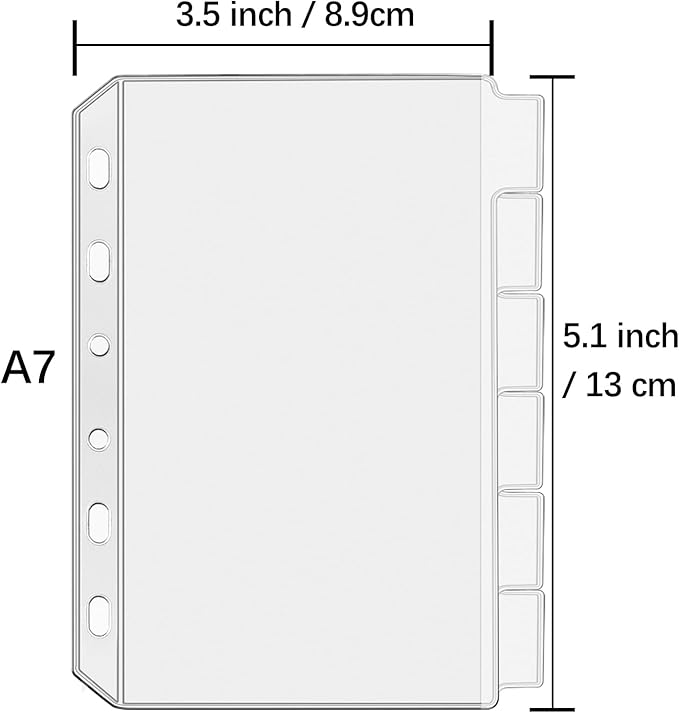 - 【12PCS A7 Size Binder Pockets Featuring Index Bits Design】:Each pocket measures 3.5 x 5.1 inches and is designed to fit a standard 6-ring notebook binder. Use these pockets to organize bills, cash, vouchers, and more. The index bit design helps you easily locate various storage categories.