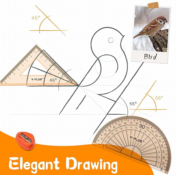 - Package Includes: 1 Ruler (6 inches), 1 Set Square (30°/60°), 1 Set Square (45°), 2 Metal Protractors, 1 Eraser, 1 Manual Pencil Sharpener, 1 Compass, 1 Pencil for Protractor.
