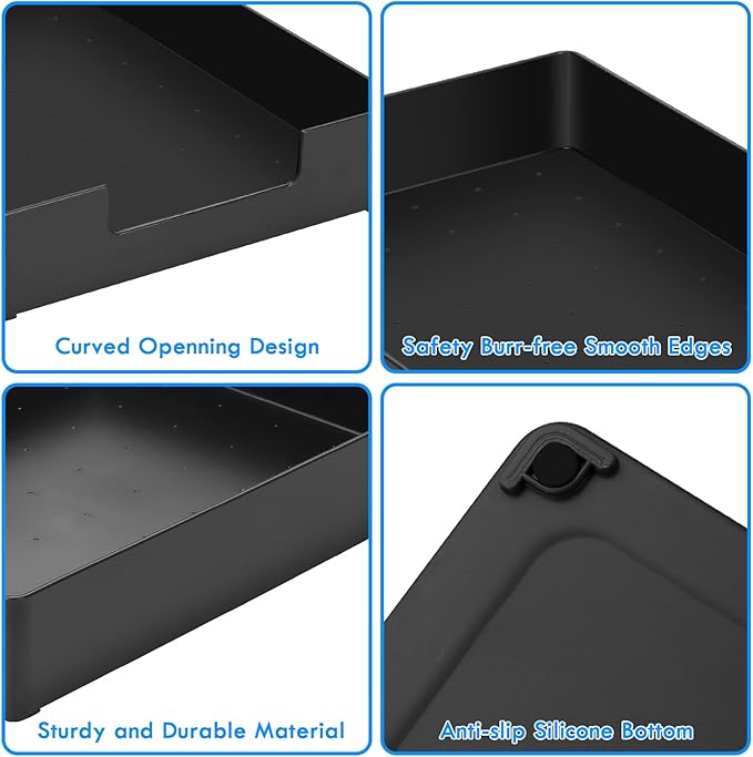 - Large Size Non-slip Plastic Paper Tray-It comes with 4 silicone pads on the bottom to sit steady in your drawer or on the desk.Large enough to satisfy multuple usage needs for different size items . Size:L*W*H=13x9.6x2.2inch. big enough suitable for A4 Sized file,document,file folder or books .
