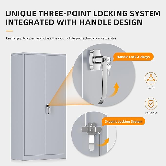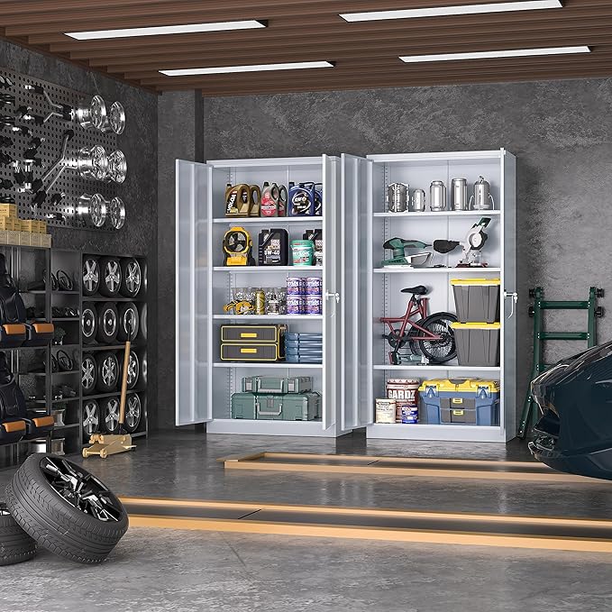 - 『4 Adjustable Shelves』: Tall storage cabinets with 4 adjustable shelves and 2 door to accommodate items of all sizes. Garage cabinets and storage system with lock picking to secure valuables, with two keys.