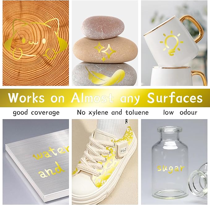 - Extensive Use: Paint pens mark steel and mark objects such as tires, bolts, metal pipes, bumper panels and more. Not just metal, Gold permanent markers can be used on rocks,wood, ceramic, canvas, tires, rubber, glass and plastic surfaces