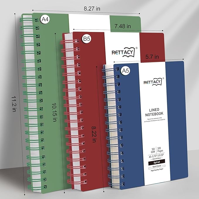 - COLLEGE RULED NOTEBOOK: RETTACY College Ruled Notebook comes in a B5 (7.6'' × 10'') size, 150 Sheets/300 Pages, Sturdy Twin-wire Spiral Bound, 7 mm college ruled writing space, 100 GSM Acid-free Paper, Sticky Notes