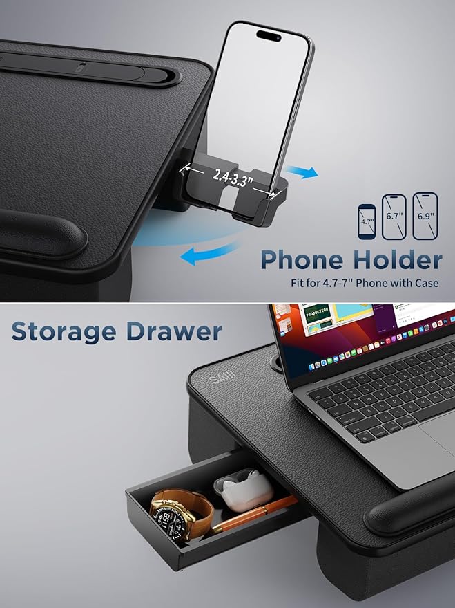 - Built-in Storage Drawer & Phone Holder Lap Tray: This laptop tray table is designed with a concealable drawer and a phone holder on the sides. They are both designed to save space when not in use. You can store necessary small items on the drawer such as pencils, a remote, earphones, keys, glasses, etc. when working on a bed or couch. The side phone holder allows you to stay connected while working or coloring.