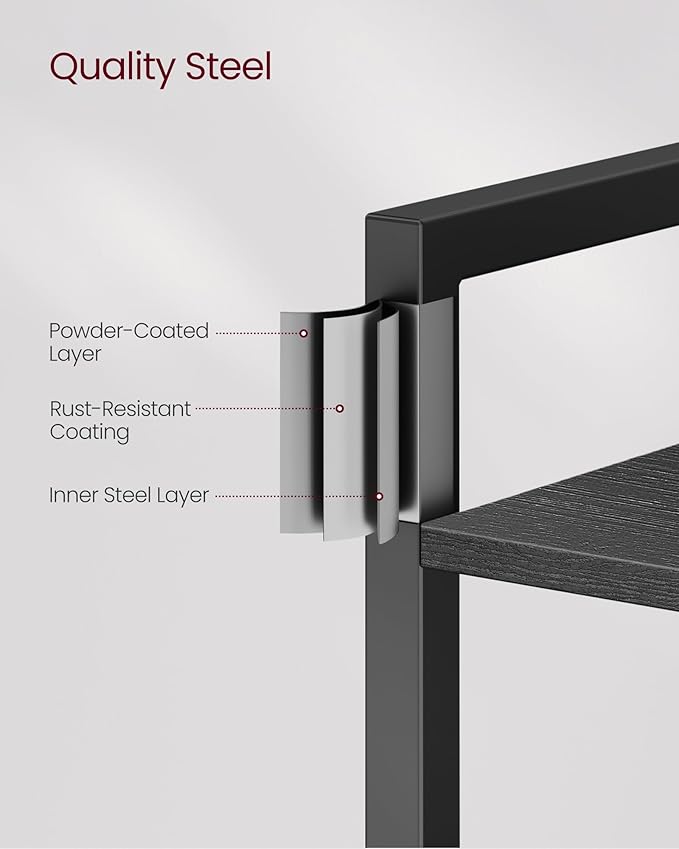 - Embrace an Industrial Vibe: The black shelves paired with a black steel frame create a stylish industrial look, allowing this freestanding shelf to fit seamlessly in with your home decor and give your space an instant update