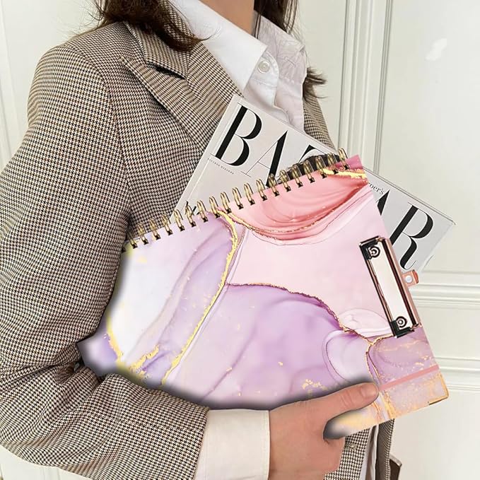 - 【Multi-Function Clipboard】Low-profile clip arc design make it easy gripping and extraction paper, holds up to 80-100 sheets paper. Clip board has a Hidden retractable hanging hole on the top, easy to hang. Pen Loop for quick, easy storage. Double-loop Metal Spiral have the ability to flip the cover to the backside and use it like a clipboard, no creases and cracks to offer durability. Elastic closure, The elastic band keeps the portfolio closed and prevents contents from getting damaged.