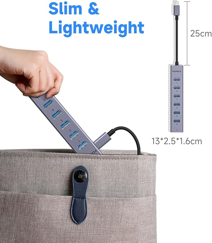 - 【7 Port USB HUB 3.0】FORIDA USB C HUB turns one USB port into Seven, support for USB Flash drive, Mouse, Keyboard, Printer, or any other USB Peripherals. And it's backward compatible with your older USB 2.0 / 1.0 devices.
