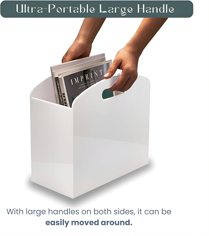 White Magazine Holder - Acrylic Magazine Rack Floor, Newspaper Stand with handles, Modern Lucite Magazine and Book Basket Box for Bathroom, Bedroom, Living Room