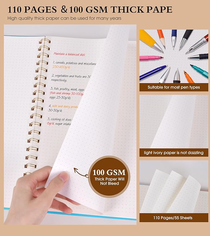 - 【100 GSM Ink-friendly Paper】 Our blue spiral dot grid notebook pages are very thick, which avoids ink bleeding through and ghosting. Suitable for most pen types, such as ballpoint pens, fountain pens. Each dotted journal 55 sheets/110 pages, offering enough space to write in. Allowing you to write on both sides of every page to maximize your usable space. light ivory paper is not dazzling, let you have a comfortable writing experience.