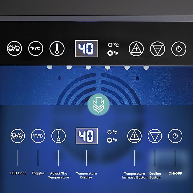 - One-touch operation & LED light - With an adjustable temperature range of 37-65°F (3-18°C), this beverage fridge offers easy one-touch settings at the touch of a button on the LCD display, providing speedy refrigeration at all times. The mini fridge built-in soft blue ambient LED lights keep your beverages in a classy atmosphere and can help you select your favorite drinks in a dark setting