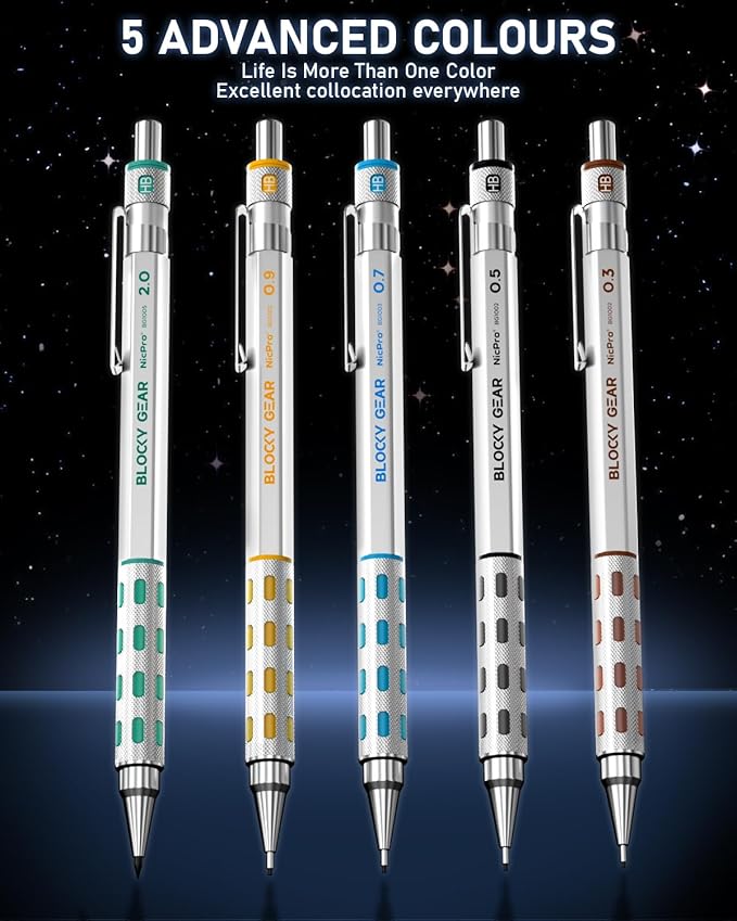 - Sleek Design with 5 Color: This sketching pencil comes in 5 classic colours designed by our designers, black, brown,blue, green, yellow, give you more fun in daily life and make you feel relaxed. Full metal hexahedral barrel, house an adjustable hardness indicator, slim metallic mesh grip inlaid with comfortable rubber pads. Ideal weight balance for fatigue free writing and drawing