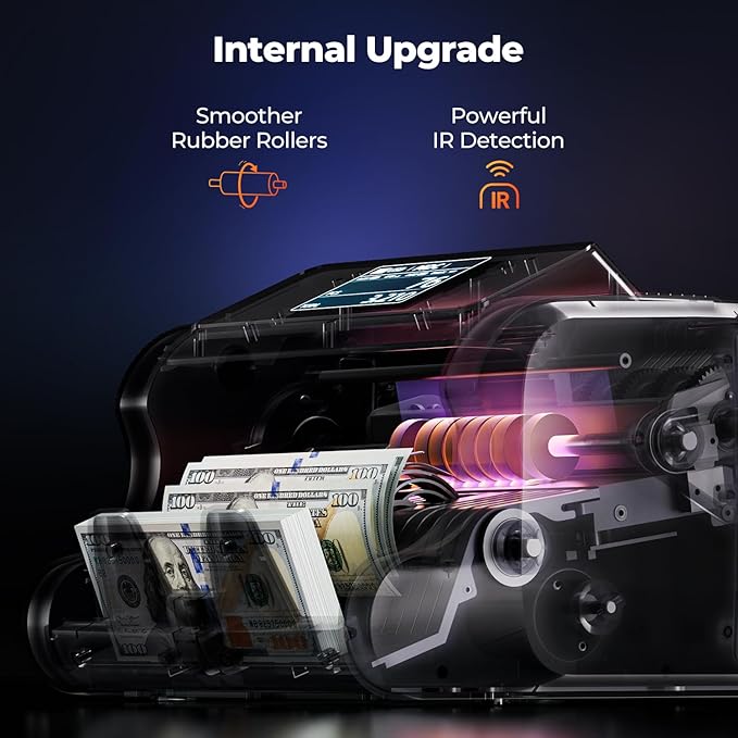 - [Bank-Grade Counterfeit Detection] With 2 special Infrared Detection tubes, our money counting machine uses UV/IR/MG/MT detecting technology to examine the bills. Using Magnetic, Infrared, Ultraviolet, Dimensional, Thickness, Security Line, Variable Ink, Spectrum, and Fluorescence Detection techniques to completely protect your company from false bills