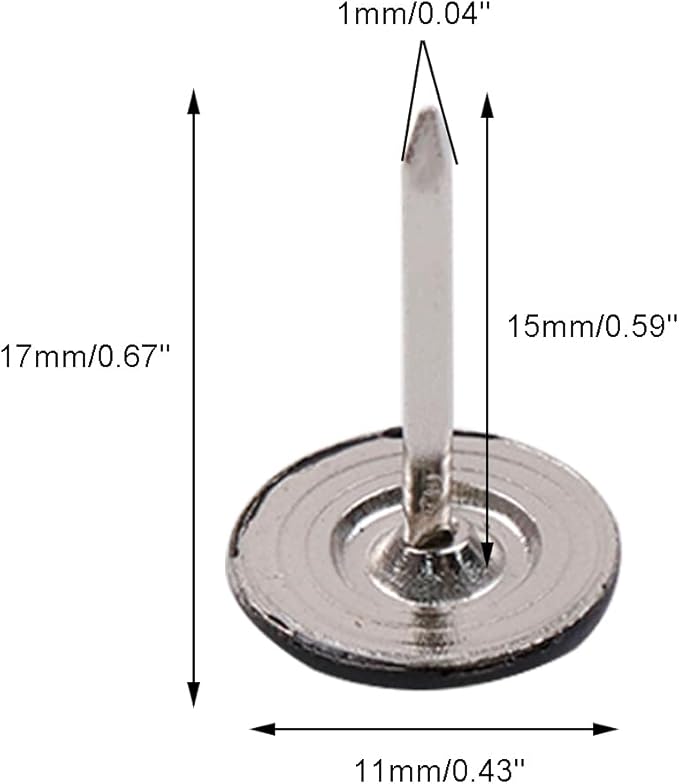 - PACKAGE CONTENT: 100Pcs black flat head upholstery tacks, enough quantity to meet your daily needs. Total Size:11mm*17mm/ 0.43" * 0.67"(Dia.xH), elegant for furniture decoration