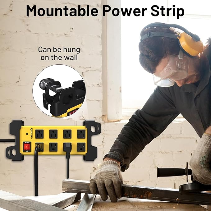 Plug'n 8 Outlet Heavy Duty Power Strip,Wide Spacing,Workshop Surge Protector 2700J with 6FT Extension Cord,Industrial Metal Power Strip 15Amp,Yellow Wall Mount Power for Garage,Office