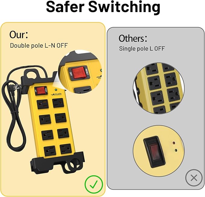 - Durable Housing:Damage-resistant aluminum yellow housing for power outlets is clearly identifiable in tools.Highly abrasion-resistant metal power strip protects circuits from fire,impact or rust