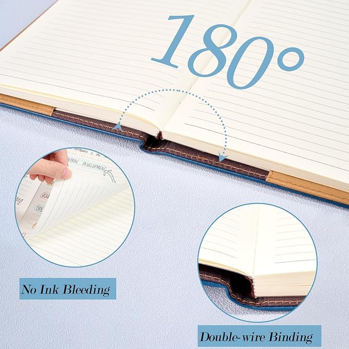 - 200 Pages Ink-proof Thick Paper Journal: 100 GSM quality paper is excellent for fountains pens and ink. No feathering and bleeding. Light yellow paper can protect your eyesight. 200 pages diary notebook/100 sheets college ruled lined notebook papers, good for daily use. Lay flat design, let you reading more easy and note-taking efficiency. Enjoy your writing by hand with no distractions. Perfect as journal for writing, travel notebook, business a5 notebook, teen journal, back to school gift.