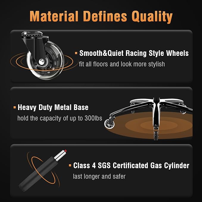 - Durable Chair For Most People: With a durable metal base, a heavy-duty gas cylinder, and smooth-rolling racing-style wheels, our work chair is made to last. It is extra-sturdy and stable and makes a long-lasting office accessory. The 300-pound weight capacity accommodates people with big or large body types, and the wide seat makes getting in and out easy