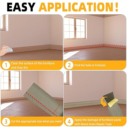 - High Quality - The Wood Grain Repair Tape is made of high quality Self Adhesive, which is durable and elastic, with a smooth surface and not easy to be dirty.When you repair Tables, Chairs, Baseboards, Doors, Windows, Floors, All Kinds of Furniture Renovation, Wood Grain Repair Tape will be your first choice