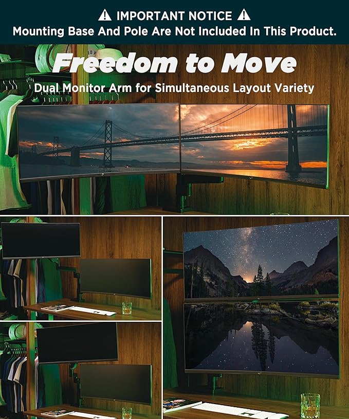 - Modular Extension Arms - The base with extra tall pole has 88 pounds mounting capability, which can be upgraded to a dual monitor mount or triple monitor mount. Dual stacked monitor mount fits up to two 49" ultrawide monitors. Triple monitor stand fits two stacked monitors and a sideways monitor.