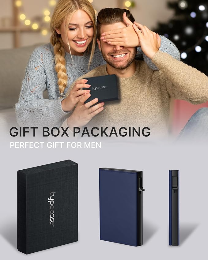 typecase Mens Wallet Card Holder: Pop Up Aluminum Case, Premium Genuine Leather, Smart, RFID Blocking, Slim, Minimalist, Front Pocket - 9-14 Card Capacity | ID Window | Cash Slot (Navy)