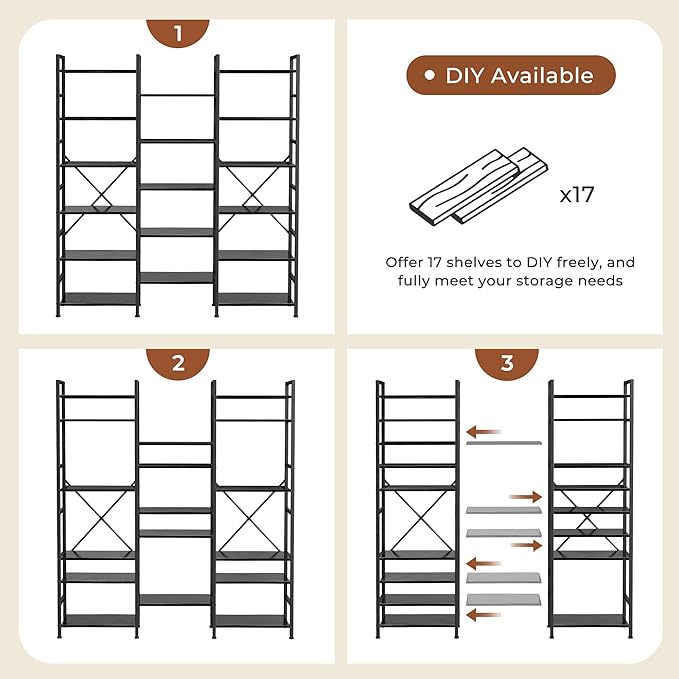 - 【STABLE AND DURABLE】Crafted from steel frame and particle board, this wide bookshelf has high stability and long service life, each shelf can hold up to 70 lbs.The bookshelves come with anti-tilt brackets so you can fasten them to the wall for support.