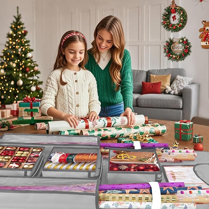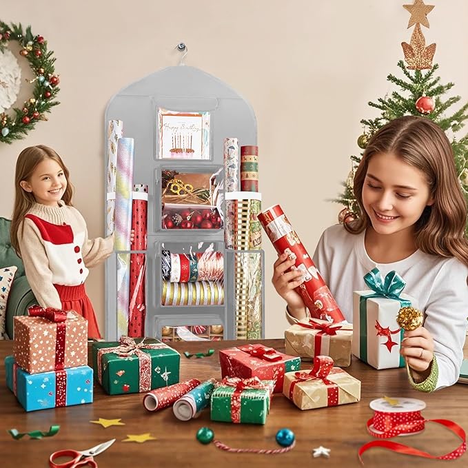- ALL-IN-ONE ORGANIZER: The front side of these wrapping stations has 2 compartments for rolls of 40-inch gift wrap or craft wallpaper, keeping your unused Christmas, birthday, or wedding gift wrap neat. 4 square bins and pockets for ribbon, small Christmas decorations, an envelope bag, bow, cards, tags, tape, scissors, tissue paper, and everything else. Their backsides each have 2 large pouches for keeping gift bags or flat gift wraps