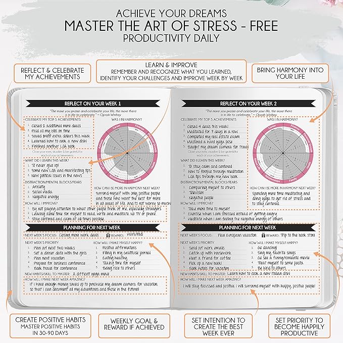 - SELF-CARE JOURNAL - This deluxe daily planner and gratitude journal comes in A5 size (5.8 x 8.3 inches). The life planner comprises 264 pages of thick 100 gsm paper, including 90 daily planning sheets, guiding you on how to become the best possible version of yourself on a mental, physical, and interpersonal level. It's a unique diary based on leading scientific studies proven to increase productivity and happiness. The journal features an out-foldable vision board to help you stay focused, morning and evening power questions, mind maps, reflection pages, habit trackers, a back pocket, and much more than any other planner on the market!