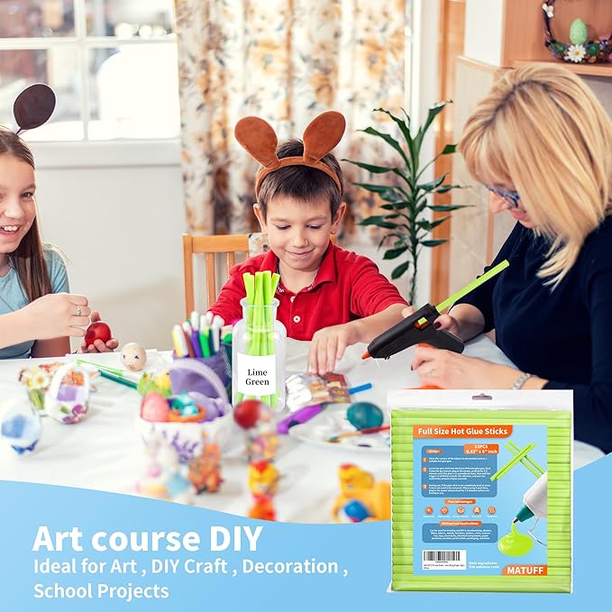 - 【Value Pack】54 pcs lime green hot glue Sticks Full Size, 11mm/0.43 inch diameter and 200mm/8 inch Length, Long hot glue sticks smooth operation, No need to change glue sticks Frequently, for variety holiday decorations, crafts, arts creation gluing projects and most repair use