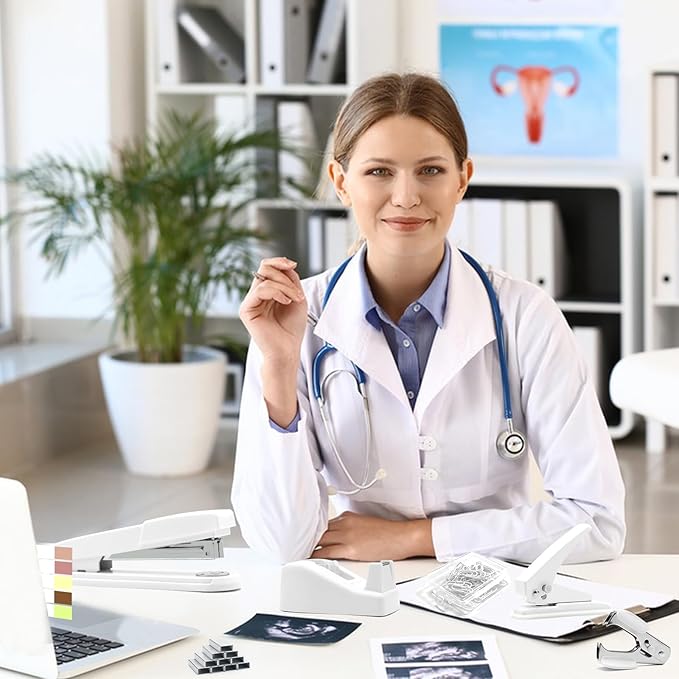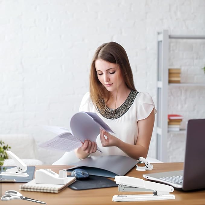 - 【Package Includes】This white office supplies contains 1x White Large Stapler, 1x White Staple Remover, 1000x Staples, 1x White Tape Dispenser, 1x Office Scissor, 50x Paper Clips and 10 colors Tabs with ruler.