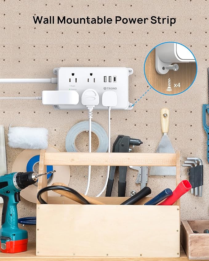 - Wall Mount Power Strip: This wall mountable power strip is a screw mountable design. Four screw-mounting tabs allow you to securely install this power strip and easily be reached, including behind the TV, workbench, garage, bedside, bathroom, laundry room, or under desk or cabinet, which is very low-profile and saves desktop space for you