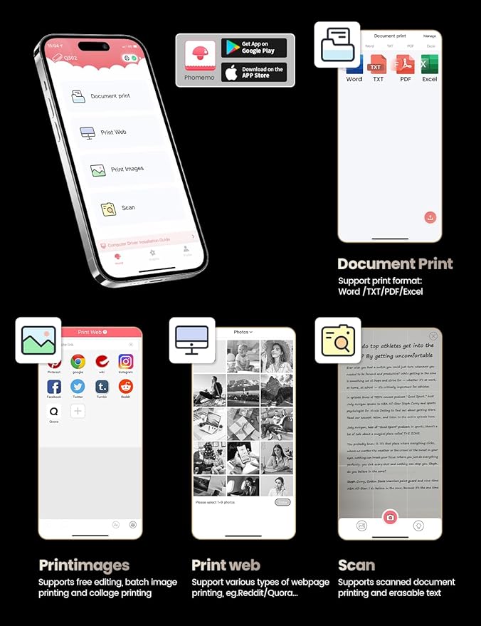 - Easy to Use One-touch Printing: Phomemo Q302 compact printer is designed to be simple, with user-friendly APP and a straightforward setup process. Phomemo Q302 travel printer package contains 20 pages of test print paper, making the Q302 mobile printer easy to operate. This saves you time and reduces the need for ongoing technical support, allowing you to focus on more important tasks. Our user manuals and online tutorials provide clear setup and operation instructions, making it easy for new users to get started