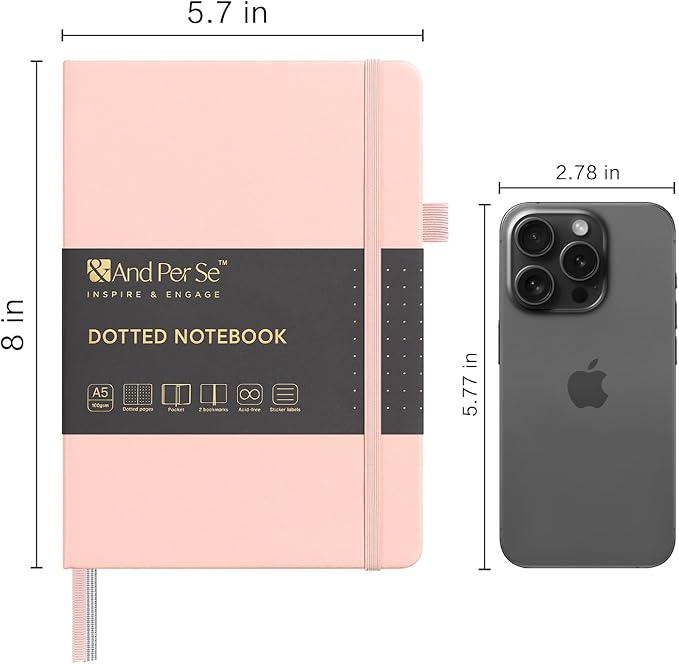 &And Per Se Dotted Journal Notebook, A5 Hardcover Leather Bullet Dotted Journal, 160 Pages 100 gsm Thick Paper,3 Sheets of Stickers Included - 5.7'' x 8''(Pink)
