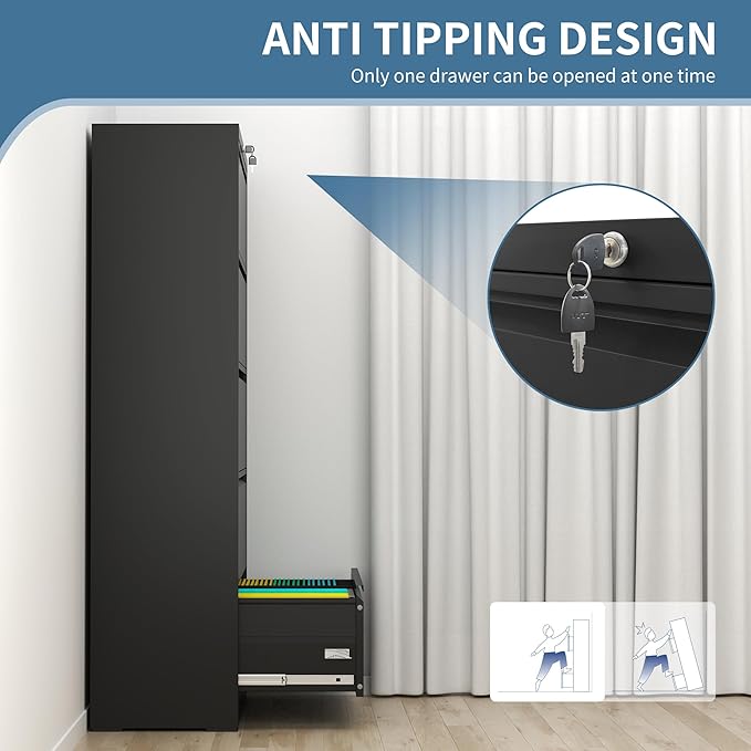 - 【Strong Storage】:36" Wide steel file cabinet with high-strength cold-rolled steel frame for long term use. And each drawer can hold up to 110 lbs, total 550 lbs. And the top of black file cabinet 5 drawer can place printers, scanners, and other office supplies.