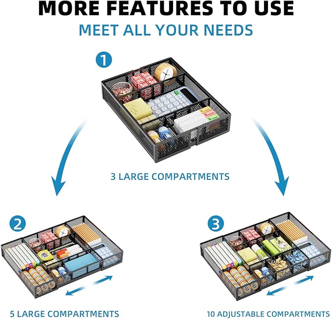 - 【Expandable Drawer Organizer】: Marbrasse newly launched the expandable drawer organizer! The humanized drawer organizer tray owns 2 sliding extension-type compartment which designed to fit any drawer, from 9.17 inches up to 17.12 inches. This drawer organizer specialized to comply with your desk, such a perfect supplies desk organizer must be the best choice for your office accessories