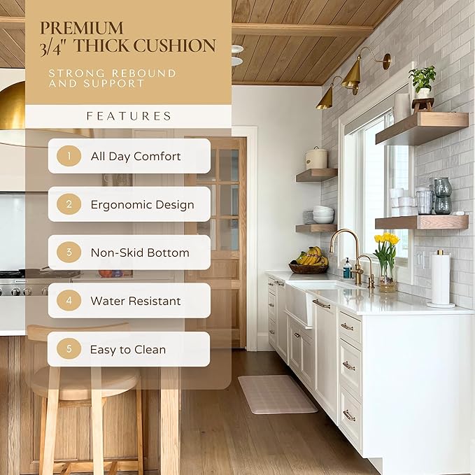 - BEAUTIFULLY DESIGNED: Elevate the aesthetics of your home with our beautifully curated anti-fatigue kitchen mats. With practical and timeless designs, these premium standing mats seamlessly blend beauty with functionality elevating your home, standing desk, work station, and any space where you stand.