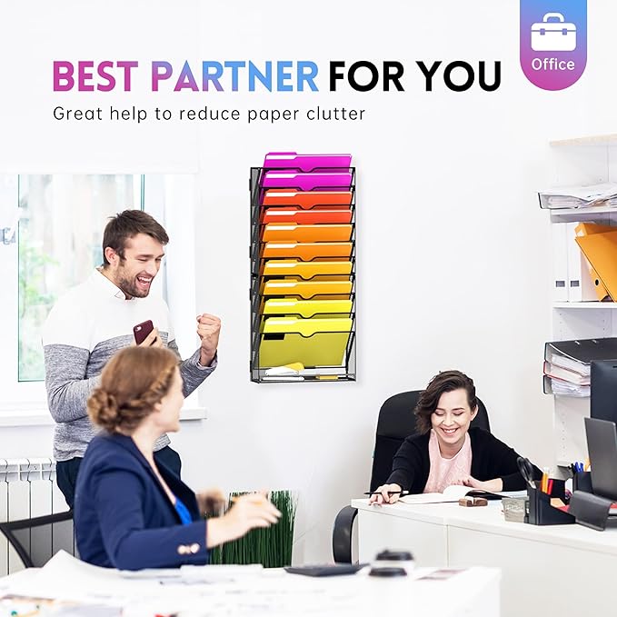 - [Put Your Walls to Work] Transform unused wall space into a vertical file organizer. This wall file organizer has 11 divided slots, providing larger space for notebooks, file folders, planners, magazines, documents, calendars, letters, invoices, mails. This rack is the perfect addition to any collaborative space, home office, private office, lobby or hospitality area.