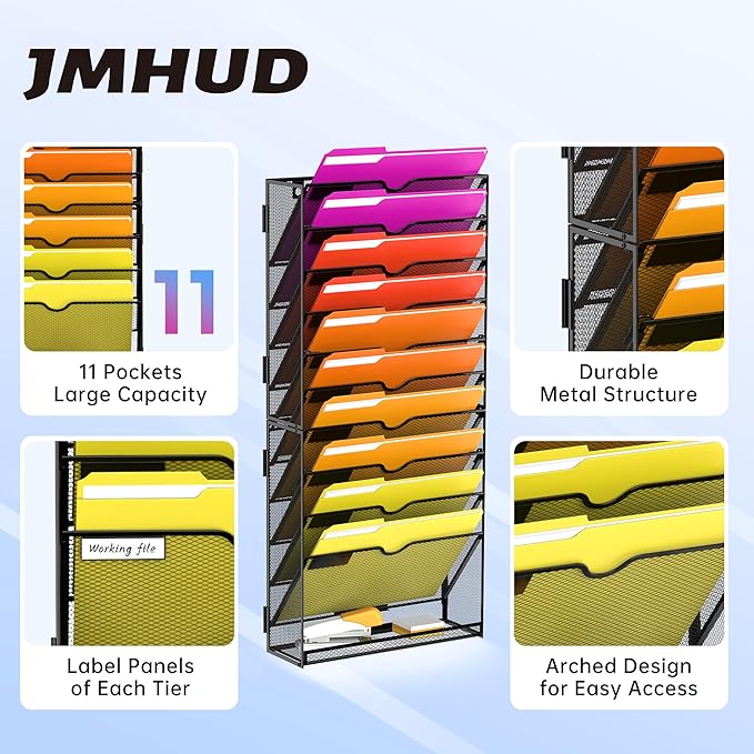 - [Put Your Walls to Work] Transform unused wall space into a vertical file organizer. This wall file organizer has 11 divided slots, providing larger space for notebooks, file folders, planners, magazines, documents, calendars, letters, invoices, mails. This rack is the perfect addition to any collaborative space, home office, private office, lobby or hospitality area.